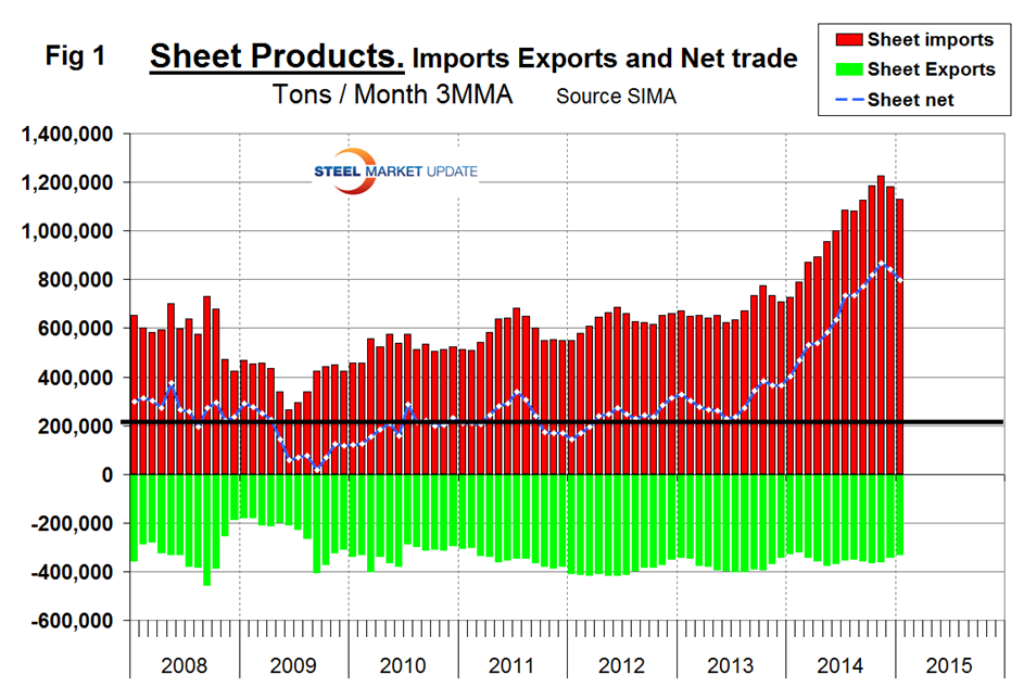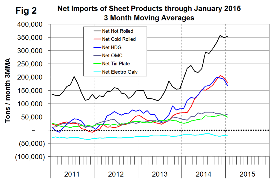 Net imports equals imports minus exports. We regard this as an important look at the overall trade picture and its effect on demand at the mill level. Figure 1 shows that net sheet product imports on a three month moving average (3MMA) basis in January were almost double that which existed before the recession.