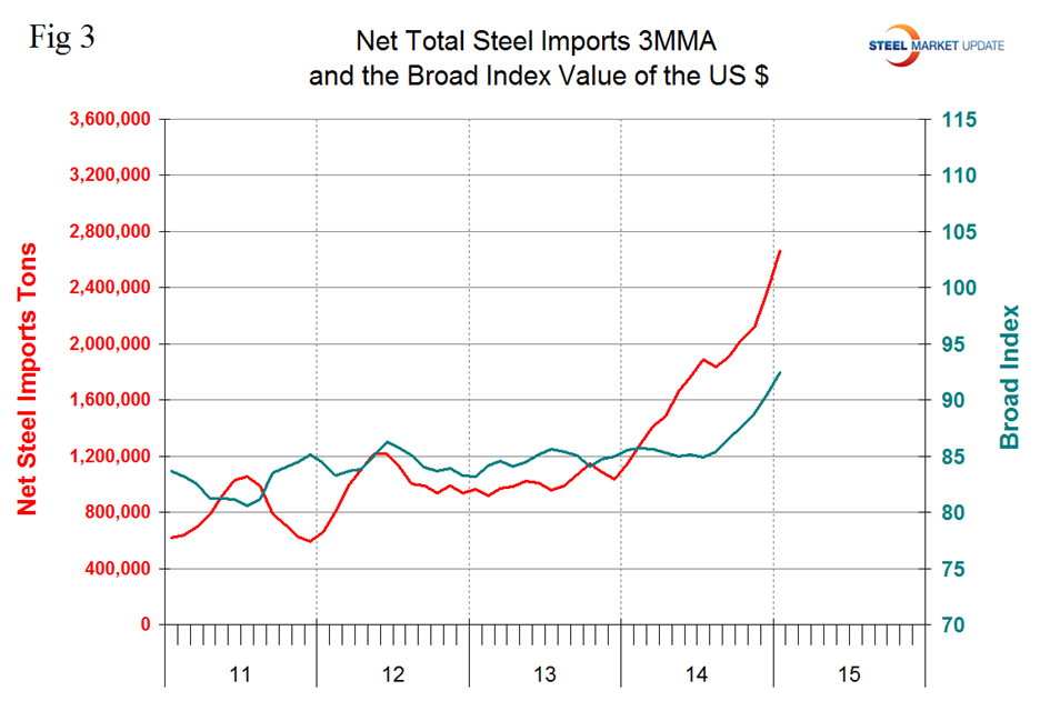 We believe there are two main drivers of the increase in net steel imports. The trade weighted value of the US $ is strengthening which makes our exports less attractive to foreign buyers and makes the US domestic market more attractive to foreign sellers. Figure 3 shows the relationship between net imports and the value of the $ since January 2011.