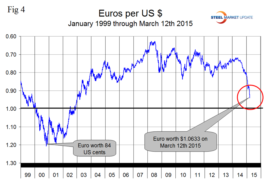 The accelerating decline is a result of the ECB’s quantitative easing program of bond purchases that began on Monday. Parity in the very near future now looks like a probability. The second reason is that steel demand in the US is strong at the same time as global demand growth has flattened. The global economy was recently described by Larry Somers as flying on one engine, that being the US. This is exactly what happened in the late 1990s after the Far Eastern currency crash which was followed by a decline in the Euro to below parity with the US dollar. In the period November 2014 through January 2015, the growth of global steel production was only 0.2 percent year over year. As global steel capacity has increased, capacity utilization has decreased and now stands at 72.9 percent. Declining steel demand abroad, strong demand in the US and a skyrocketing US dollar is not a pretty picture for the US steel industry for at least the balance of 2015.