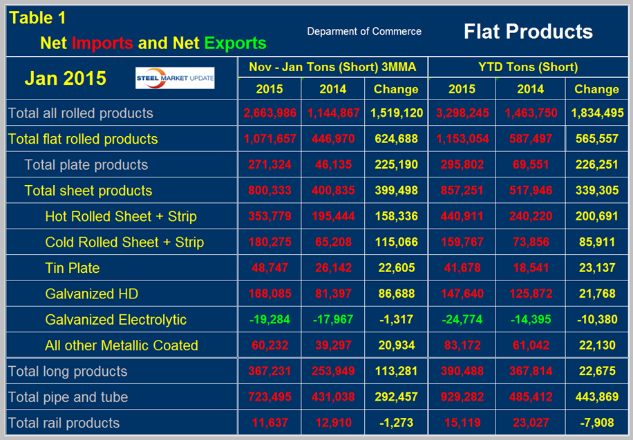 Year to date through January (one month only), total net flat rolled imports were 1,153,054 tons, of which 857,251 tons were sheet products. On a three month moving average basis, (3MMA), November through January net sheet imports increased by 399,498 tons year over year. The 3MMA of net imports increased on all products except electro-galvanized and rail which were down slightly. Electro-galvanized was the only product to have a trade surplus in 2013 and 2014 and this continued into 2015. In Table 1 negative net imports, (which means a trade surplus) are shown in green. Figure 2 shows the trend of monthly net sheet product imports since January 2011 on a 3MMA basis. Cold rolled and HDG have both decreased in the last two months but hot band after declining in December picked back up in January. The trade surplus of electro-galvanized has been steadily increasing for over three years.