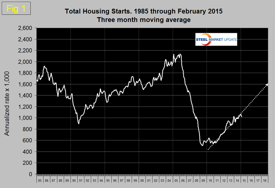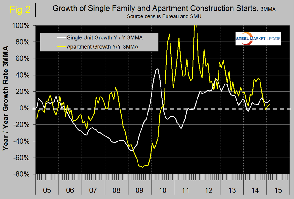 Multi-family starts are now beyond the pre-recession high of February 2006 but the growth of starts in this sector has slowed dramatically from a 3MMA year over year of 35.5 percent in August to 3.2 percent in February, (Figure 2). If we ignore the growth spurt of mid-2014, this sector has been slowing since early 2012 and may be approaching saturation.