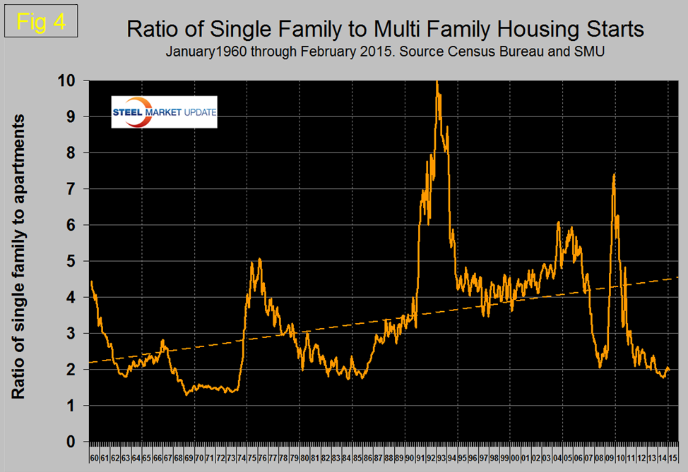 Single family is still 67.5 percent below the pre-recession level but growth in this sector has been higher than multi-family for the last four months. Figure 3 shows the trajectory of single family and apartments.