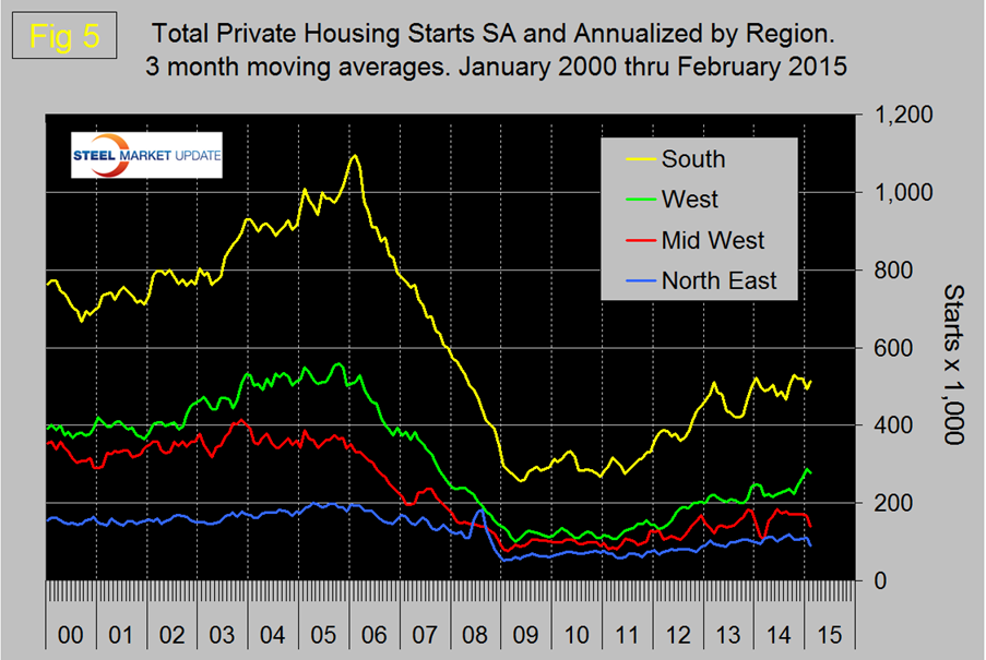 Figure 5 shows the regional situation for total residential starts since February 2000. In the latest data the South was the only region to experience and increase as the Mid-west bore the brunt of the decline.