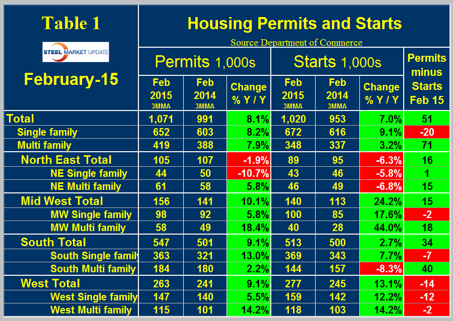 Permit data is useful is useful as a forward look at starts. If permits exceed starts then we anticipate an acceleration in construction starts and vice versa. Table 1 shows total permits and starts nationally and regionally.