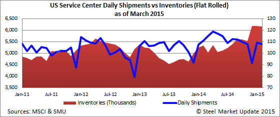 According to data just released by the Metal Service Center Institute (MSCI), U.S. service centers shipped 3,332,300 tons of all steel products during the month of February 2015. The daily shipment rate was 166,600 tons per day, down 1.4 percent over February 2014 when the daily shipment rate was 169,000 tons. In comparison to the previous month, February daily shipments were down 0.7 percent from the 167,800 ton rate in January. Note that there were 20 shipping days in both February 2015 and February 2014, while January 2015 had 21. Total steel shipments were down 1.4 percent year over year.