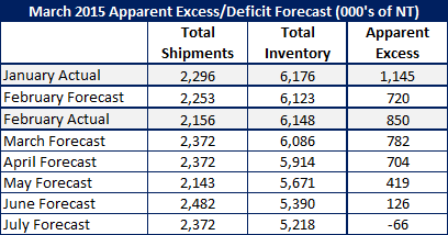 We are forecasting total shipments of 2,372,000 tons and inventories dropping to 6,086,000 tons. If we are correct in our forecast the Apparent Excess should drop to 782,000 tons.