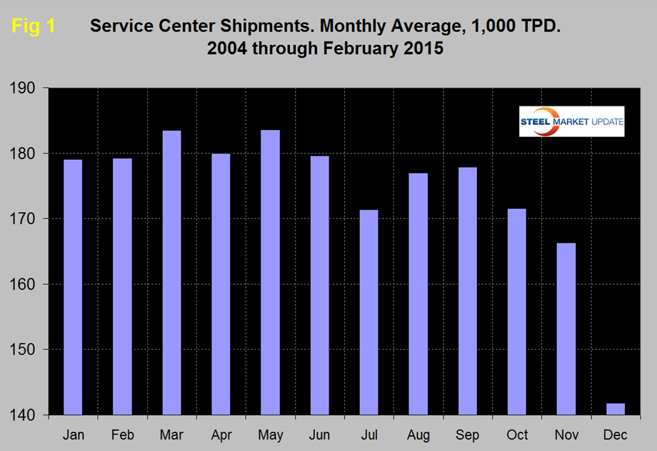 In the eleven years since 2004 February shipments on average have been 0.1 percent higher than January. This year February was down by 0.7 percent from January so this was not a particularly good result. Figure 1 demonstrates the seasonality of service center shipments and why comparing a month’s performance with the previous month is usually misleading. For this reason in the SMU analysis we always consider year over year changes.