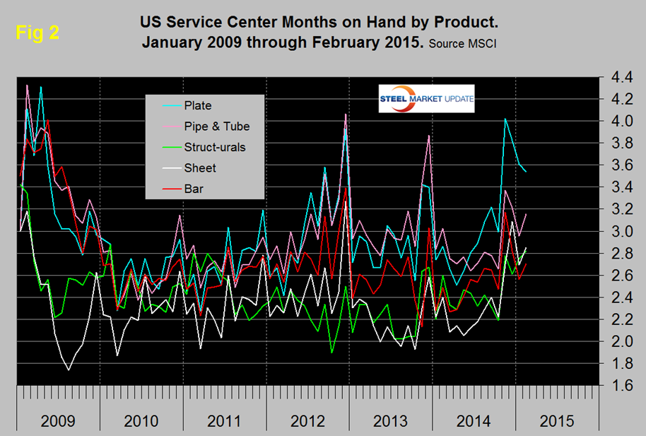 February closed with months on hand (MoH) at 2.94, up from 2.8 at the end of January. Compared to the end of February last year, moth end inventories were up by 15.4 percent in total. All products had a year over year inventory increase led by plate which was up by 30.9 percent. Figure 2 shows the MoH by product monthly since January 2009. Plate products shot up to over 4 MoH at the end of November and were still high at 3.54 at the end of February.