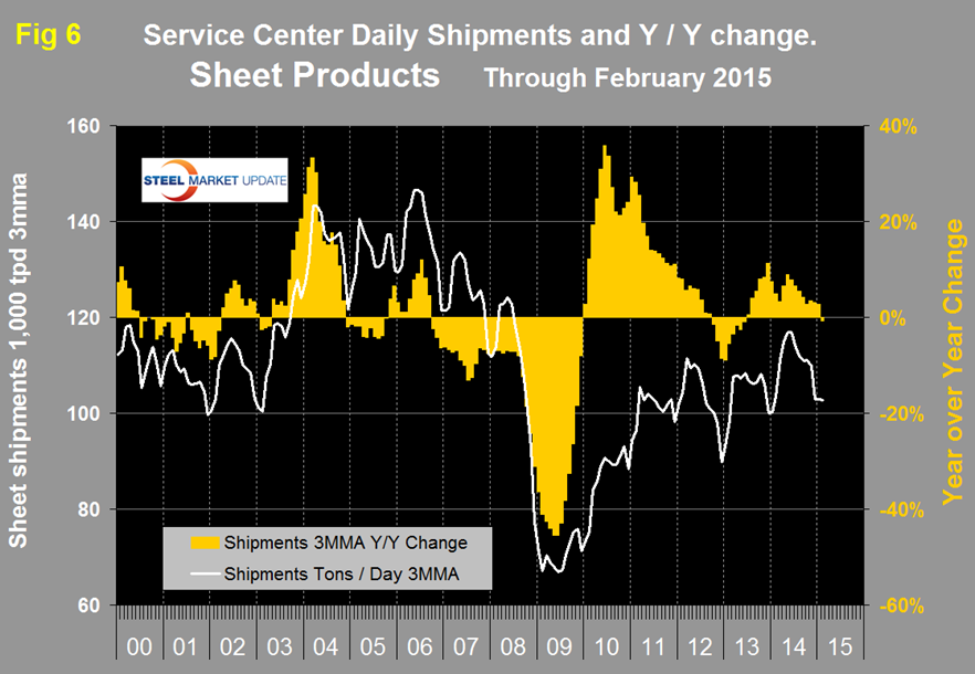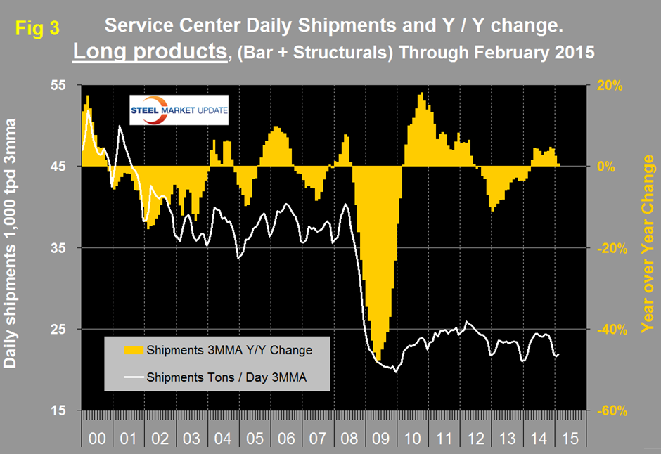 There continues to be a wide difference between the performances of flat rolled (sheet + plate) and long products (structurals + bar) at the service center level. Long products have had a very poor recovery from the recession. On a 3MMA basis y/y, the growth of shipments was negative for 21 straight months until April last year which was the first of eleven straight months of growth. However on a y/y basis growth slowed to 2.5 percent in January and was only 0.6 percent in February (Figure 3).