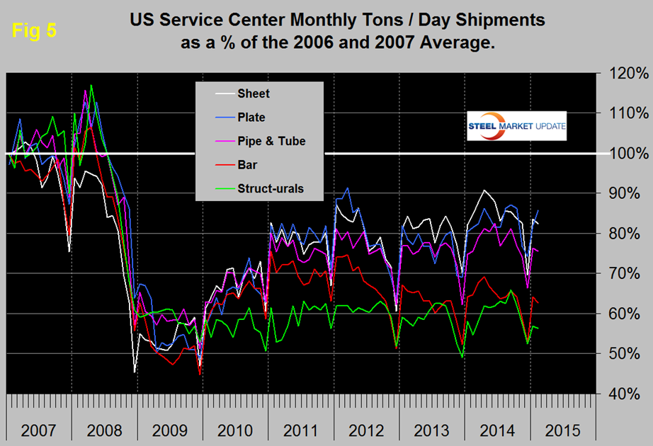 Again it can be seen that bar and structurals have the worst record. Sheet and plate have had the best recovery since the recession followed by tubulars. Even so the recovery of sheet is only at 82.4 percent and plate at 85.7 percent. The total of carbon steel products is now at 75.0 percent of the shipping rate that existed in 2006 and 2007, with structurals and bar at 56.3 percent and 62.7 percent respectively. The recovery of the service center sector has been much slower than has been experienced by the mills. Presumably this is because more buyers are purchasing mill direct and this is probably particularly true of long products. In addition long products being more construction oriented are suffering from the slow recovery of that business sector.
