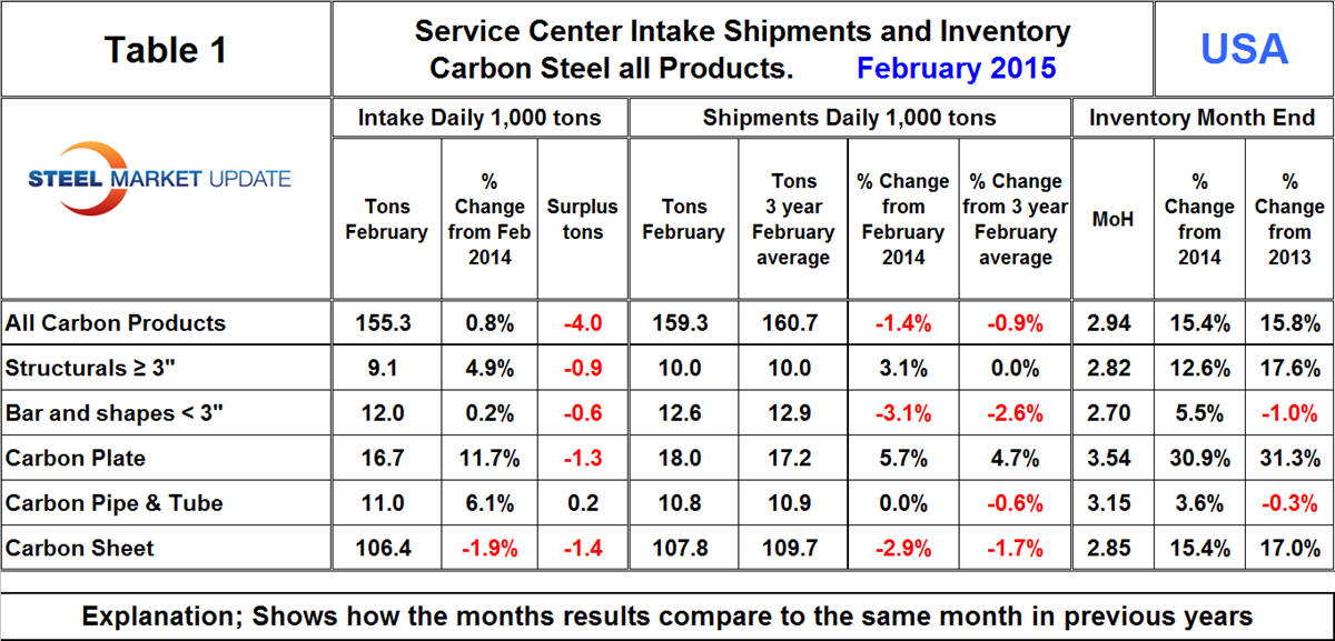 In February intake at 155,300 tons was 4,000 tons less than shipments. For all products except pipe and tube, intake was less than shipments. Shipments of all products on a t/d basis were down by 1.4 percent from February last year and down by 0.9 percent from the average February shipments for 2015, 2014 and 2013. The fact that the single month growth comparison is worse than the three year comparison is an indication that momentum is negative and growth is slowing.