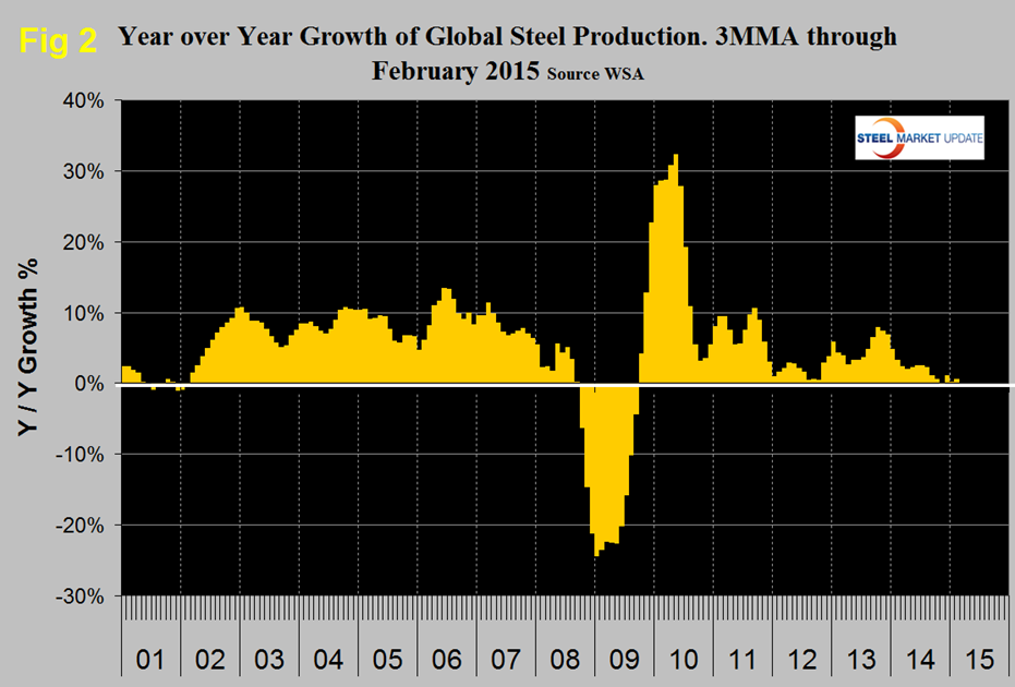 If the three month growth rate exceeds the twelve month we interpret this to be a sign of positive momentum and accelerating growth. The reverse is the case today though Asia and South America are bucking that trend. In three months through November year over year global growth declined to exactly zero, in three months through December it bounced back to 1.1 percent, in three months through January declined again to 0.2 percent and in three months through February recovered slightly to 0.9 percent. The growth rate in twelve months through February 2015 was 1.5 percent compared to twelve months through February last year. In the three months through February there were significant differences in regional year over year production. North America was down by 1.6 percent in total with the US down by 2.4 percent, Canada down by 1.8 percent and Mexico by 3.8 percent. The European Union was down by 3.1 percent and other Europe led by Turkey was down by 7.9 percent. Asia was up by 2.3 percent with declines in Japan and Korea and increases in China and India. The effect of the war in Ukraine is clear in the contraction of that country’s steel production. Figure 2 shows the 3MMA of the monthly year over year growth of global steel production which prior to December had been falling for six months.