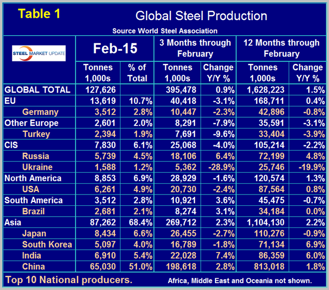 Global steel production in 12 months through February totaled 1.628 billion tonnes with a capacity of 2.2 billion tonnes which yields a utilization for the 12 month period of 74 percent. China accounted for 51 percent of global production in February. Asia as a whole, including India, accounted for 68.4 percent of global production.