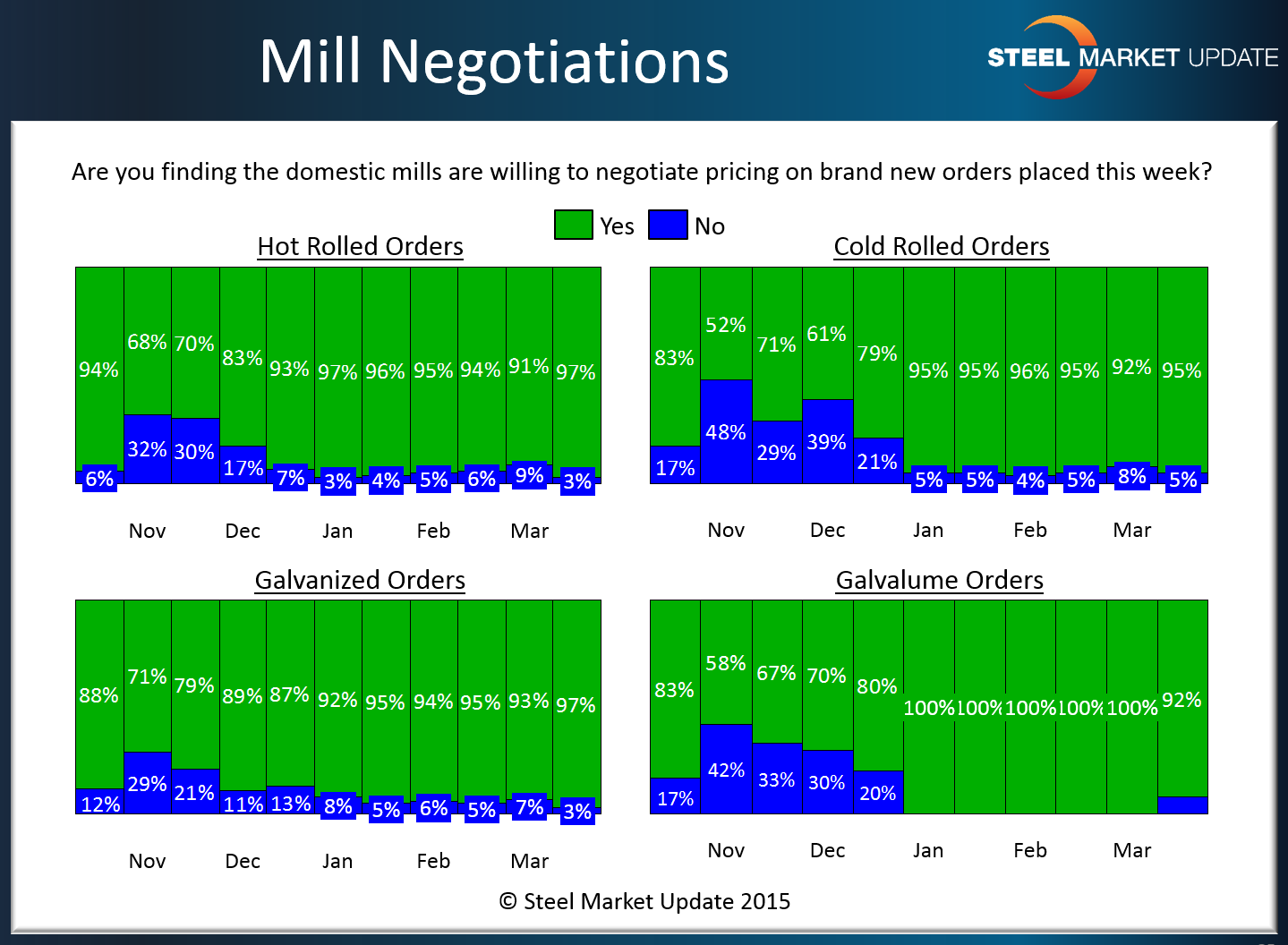 Based on the results from our most recent flat rolled steel market analysis which we conducted this past week, manufacturing companies and service centers reported domestic (USA and Canada) steel mills as willing to negotiate pricing on hot rolled, cold rolled, galvanized and Galvalume steel coils.