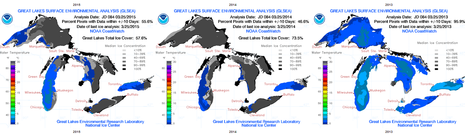 Ice coverage on the Great Lakes was fierce again this winter, reaching a peak of 88.8 percent on March 2, shy of the 92 percent peak on March 6, 2014. As you can see from the March 25 data analysis below, the coverage was at 57.6 percent on opening day.