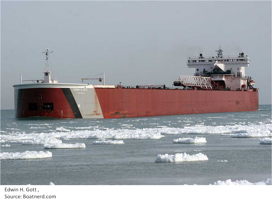 The Gott was prevented by heavy ice from continuing through the Poe Lock and had to back out and wait for assistance by the US Coast Guard cutter Mackinaw. The Poe is one of four parallel locks on the St. Mary canal that comprise the Soo Locks system, allowing ships to navigate the 21 foot drop between Lake Superior and the lower Great Lakes
