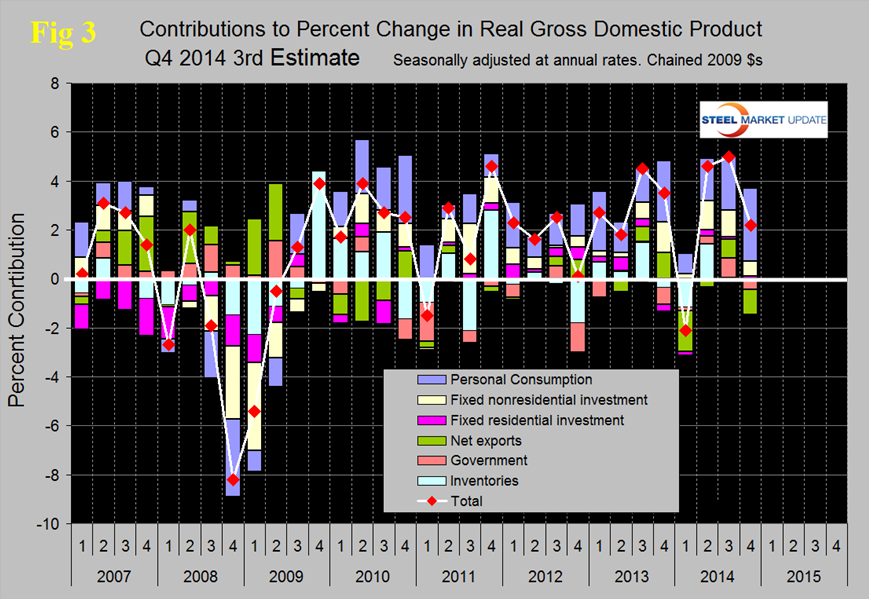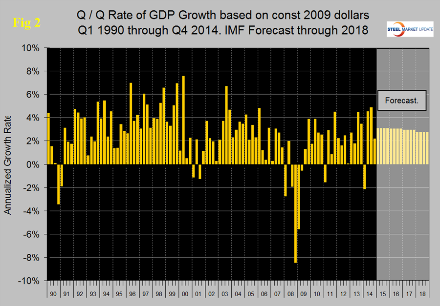 SMU Comment: We have reported frequently in the past on the relationship between GDP and steel consumption. Steel growth follows economic growth but is very much more volatile. In addition over the long run about a 2.5 percent growth of GDP is necessary to get any growth in steel consumption. Based on the trailing 12 month growth of GDP which in Q4 was 2.38 percent we can expect steel consumption to be fairly stable in H1 2015. The IMF forecast for 2015 at 3.09 percent growth if accurate suggests a moderate increase in steel demand.