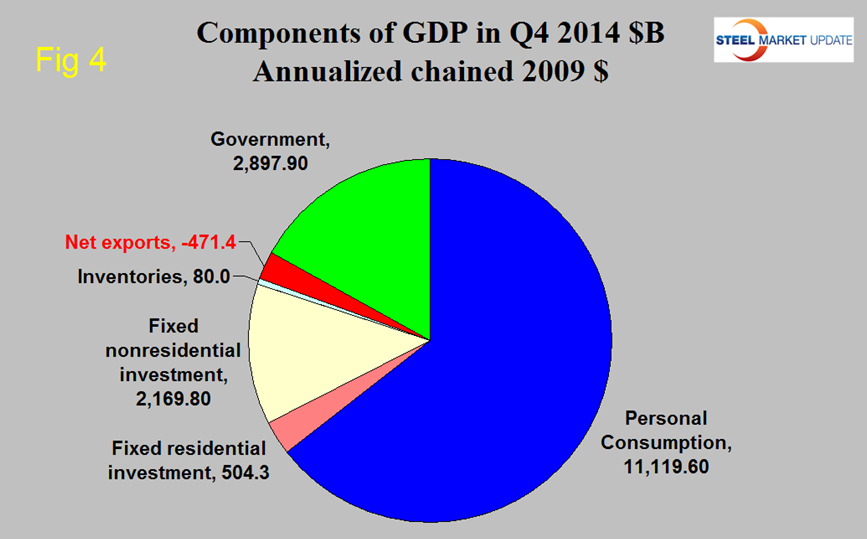 Personal consumption contributed 2.98 percent to the growth meaning that all other major components were slightly negative in total. Personal consumption includes goods and services, the goods portion of which includes both durable and non-durables. Presumably personal consumption is being driven by low gas prices. Net exports were the major negative and contributed – 1.03 percent to the total. This negative contribution can be expected to worsen as the US dollar strengthens. Government expenditures also yielded a negative growth of – 0.35 percent. The contribution of fixed residential investment was almost unchanged at 0.12 percent but the contribution of nonresidential construction declined from 1.1 percent in Q3 to 0.6 percent in Q4. In the 4th Q personal consumption accounted for 68.24 percent of total economic activity, up from 67.87 percent in Q3. Inventories which had contributed only 0.03 percent in Q3 contributed 0.1 percent in Q4. Increasing inventories make a positive contribution to GDP and over the long run inventory changes are a wash and simply move growth from one period to another. Figure 4 shows the breakdown of the $16 trillion economy.