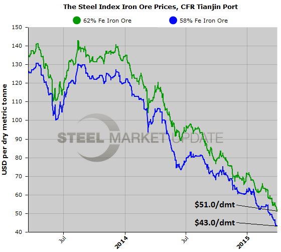 Iron ore prices, which for a period of time had firmed up around $60 per dry metric ton, have been sliding lately with The Steel Index (TSI) reporting 62% Fe fines at $51.0/dmt CFR Tianjin Port, China earlier today. This is the lowest level reported by TSI since they began indexing iron ore prices back in 2008.