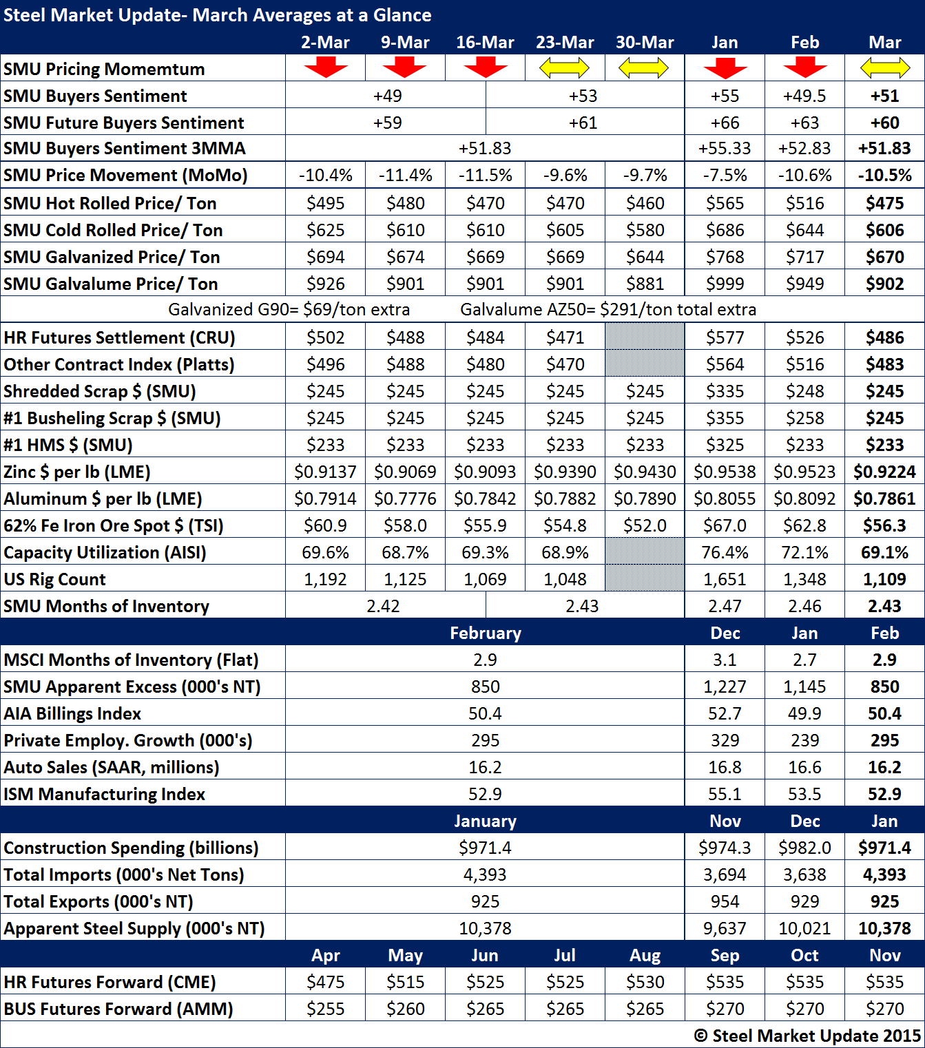 In the table below, Steel Market Update provides a snapshot look at various flat rolled steel pricing, commodities which impact steel prices and economic data of importance to the flat rolled steel industry.