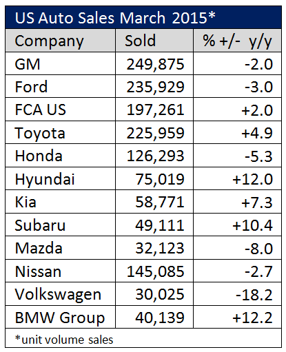 The final sales tally for US automakers in March was 1,537,820 units according to WardsAuto data, just above the forecast of 1.52 million and exceeding 1.252 million units in February. The increase pushed the SAAR for 2015 to 17.05 million.