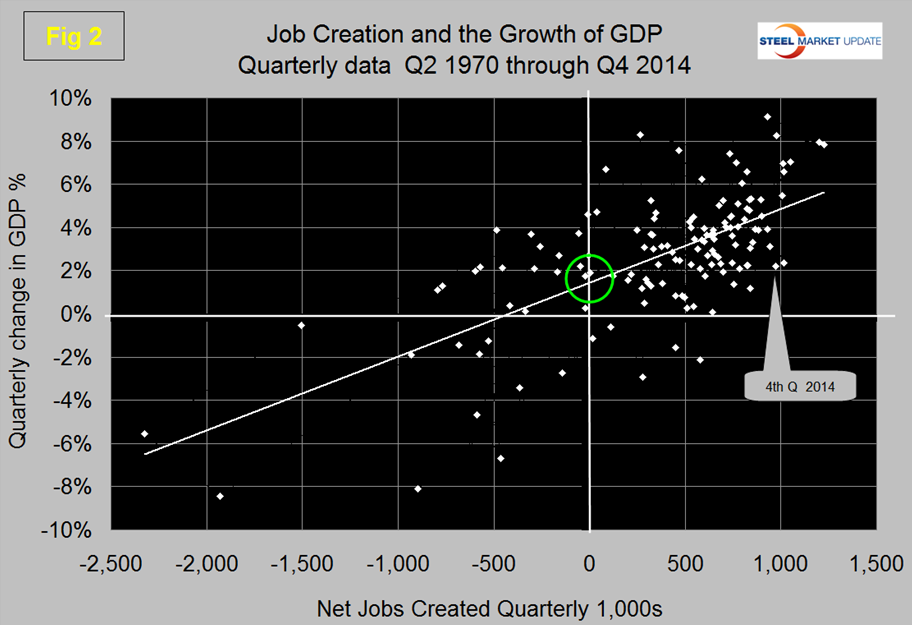 Job creation in Q4 2014 and by extension through Q1 2015 was much higher than the relationship with GDP suggests, meaning that we can expect a decline in job creation in the current 2nd Q of 2015. The intersect between GDP and job creation shown in Figure 2 looks very much like the relationship between the growth of both steel and cement consumption and GDP. It is necessary to achieve a GDP growth of around 2 percent to get any growth in employment or in steel or in cement. We don’t understand the reason for these intercepts but they appear to be a long term fact.