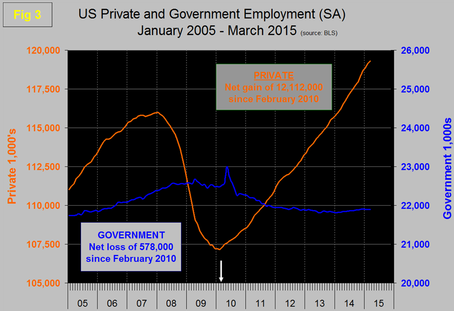 In March private employment grew by 129,000 and government declined by 3,000. Since February 2010, the employment low point, private employers have added 12,112,000 as government has shed 578,000, (Figure 3).