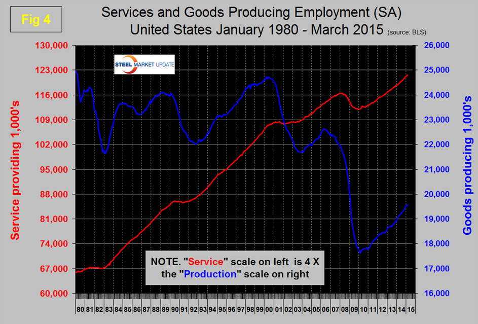 In March service industries expanded by 139,000 and goods producing lost 13,000 people. Of the losses in goods producing, 11,000 were in mining and logging which are not broken out in Table 1. Since February 2010, service industries have added 9,614,000 and goods producing 1,920,000 positions, (Figure 4).