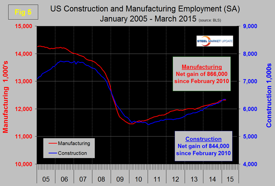 Since the bottom of the employment recession, manufacturing has added 866,000 jobs and construction has added 844,000 jobs, (Figure 5). Construction is catching up rapidly after a slower initial recovery from the recession and should soon pass manufacturing as a job creator since the recession turnaround. This bodes well for the sector that has been holding back steel demand.