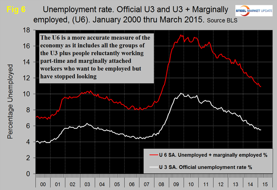 The official unemployment rate held steady at 5.5 percent in March. This number known as the U3 rate doesn’t take into consideration those who have stopped looking. The more comprehensive U6 unemployment rate decreased from 11.0 percent in February to 10.9 percent in March, (Figure 6). U6 includes workers working part time who desire full time work and people who want to work but are so discouraged that they have stopped looking. The differential between these rates was usually less than 4 percent before the recession. Since January the differential has declined from 6.1 percent to 5.4 percent, the gap is slowly closing.