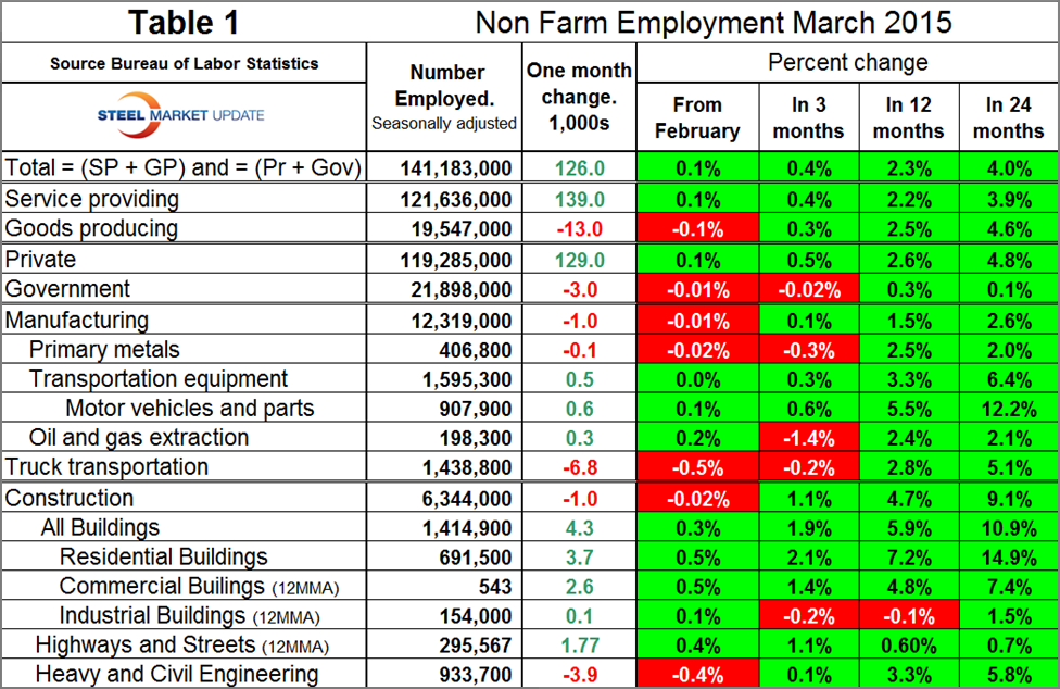 Manufacturing lost 1,000 jobs in March. Truck transportation was down by 6,800, the first negative in this sector since December 2013. Transportation equipment which is mainly motor vehicles and parts added only 500 jobs in March continuing a string of four months of weak performance. Note that Table 1 only identifies the major sectors in manufacturing and construction so the totals don’t add up.