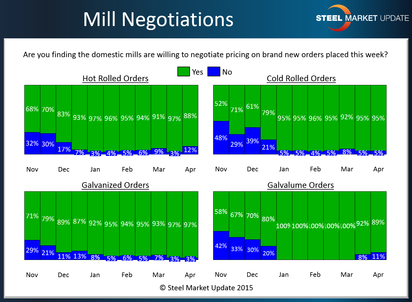 According to our survey respondents not much has changed when it comes to how willing steel mills are to negotiate hot rolled, cold rolled, galvanized and Galvalume steel pricing.