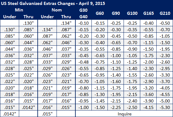 The table below compares the old extras just replaced with the new extras so you can see what changes were made. For example .0296” G90 galvanized coating extra was reduced by $1.10/cwt: