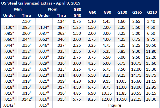 The table below compares the old extras just replaced with the new extras so you can see what changes were made. For example .0296” G90 galvanized coating extra was reduced by $1.10/cwt: