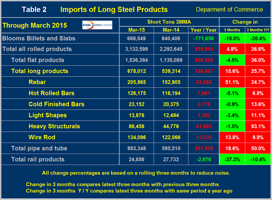 Table 2 shows the same analysis for long products. For total long products the tonnage was up by 15.6 percent, 3M/3M and by 25.7 percent y/y. There was a tremendous surge in rebar in the Q1 of this year when the volume was up by 51.1 percent compared to the Q4 2014. With the exception of wire rod, other long products declined in the 1st quarter. Imports of pipe and tube continue to surge but rail fell by 37.3 percent in the 1st quarter.