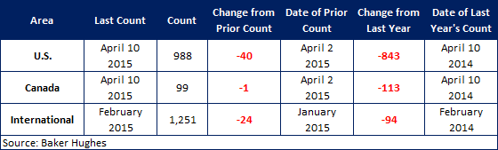 According to Baker Hughes data from April 2nd, 2015, the U.S rig count for the week was 988 rigs exploring for or developing oil or natural gas. The last time the active U.S. count was this low was back in late-August 2009 at 968 rigs.