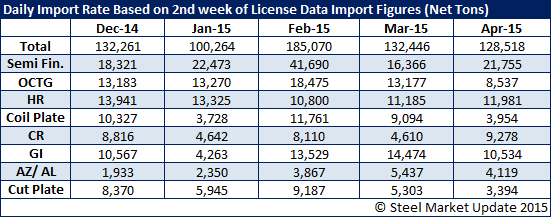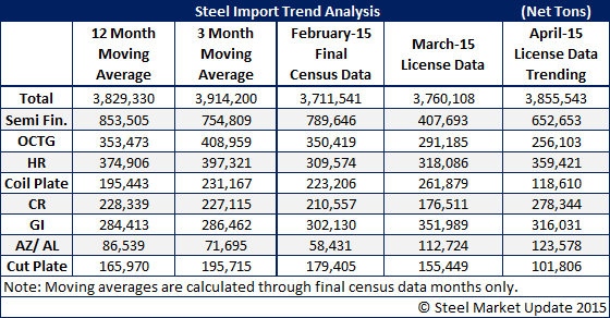 Based on the first two weeks of steel import license data collected by the US Department of Commerce, total steel imports coming into the U.S. during the month of April continue to trend well over 3.0 million tons. We are still early in the month and our opinion is the import number should be slightly lower than the 3.7 million tons received in February (final census) and March (license data as of today).