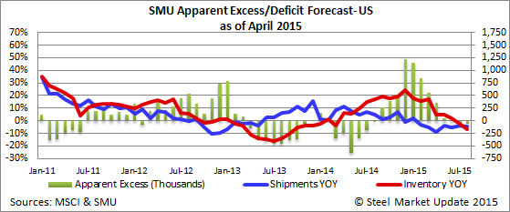 As we look out beyond April into the months of May, June, July and August we see excess flat rolled inventories drying up sooner than our previous forecast (which was calling for June before we saw a somewhat balanced inventory situation). We now see that occurring in May and then continuing to be in a relatively balanced situation through the month of August.