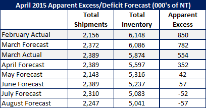 Our April forecast is for shipments to be flat against March at 2,389,000 tons for the month. Our forecast calls for flat rolled inventories to drop to 5,597,000 tons based on a daily receipt rate similar to that seen in March (96,000 tons/day). Our Apparent Inventory Excess is forecast to drop to 352,000 tons.
