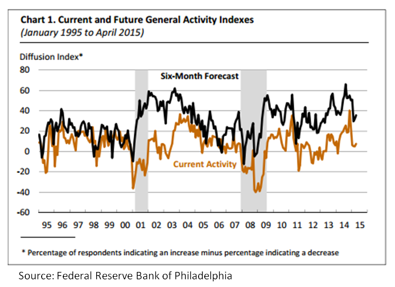 The Philadelphia Federal Reserve Manufacturing Business Outlook was stronger than expected in April. The index for current activity increased from 5.0 in March to 7.5, beating economist expectations of a reading of 6. The index has been in single digits so far this year indicating only modest growth.
