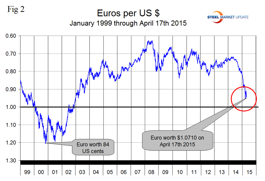 At SMU we continue to regard the saga of the Euro as having the most significant future impact on the US steel industry. On September 6th last year the Euro broke through the 1.3 US $/Euro level for the first time since July 11th 2013, on January 6th it broke through 1.20 and through 1.10 on March 7th. Since then the Euro has stayed below 1.10 and closed at 1.071 on April 17th (Figure 2).