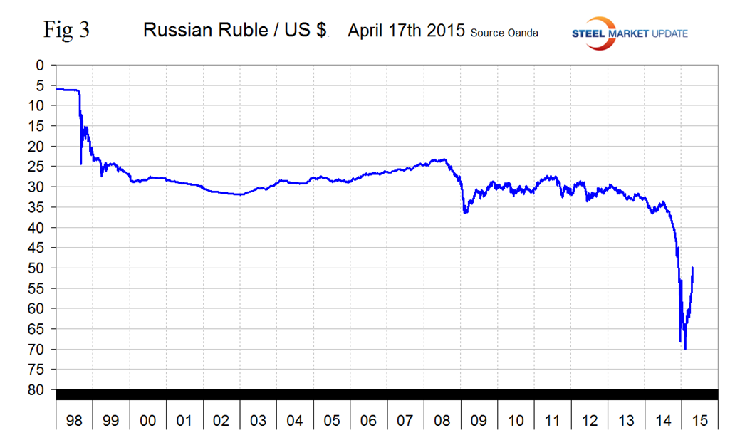 The surprise in our last update was that the Russian Ruble which had declined to slightly less than 70 to the US $ on February 1st had bounced back to 59.27 in March 23rd. The recovery has maintained its momentum through the 17th when for the first time since November 30th last year a dollar could be exchanged for less than 50 rubles (Figure 3). As it stands now the Ruble has declined by 27.6 percent against the dollar in 12 months but in the last three months has recovered by 29.3 percent.