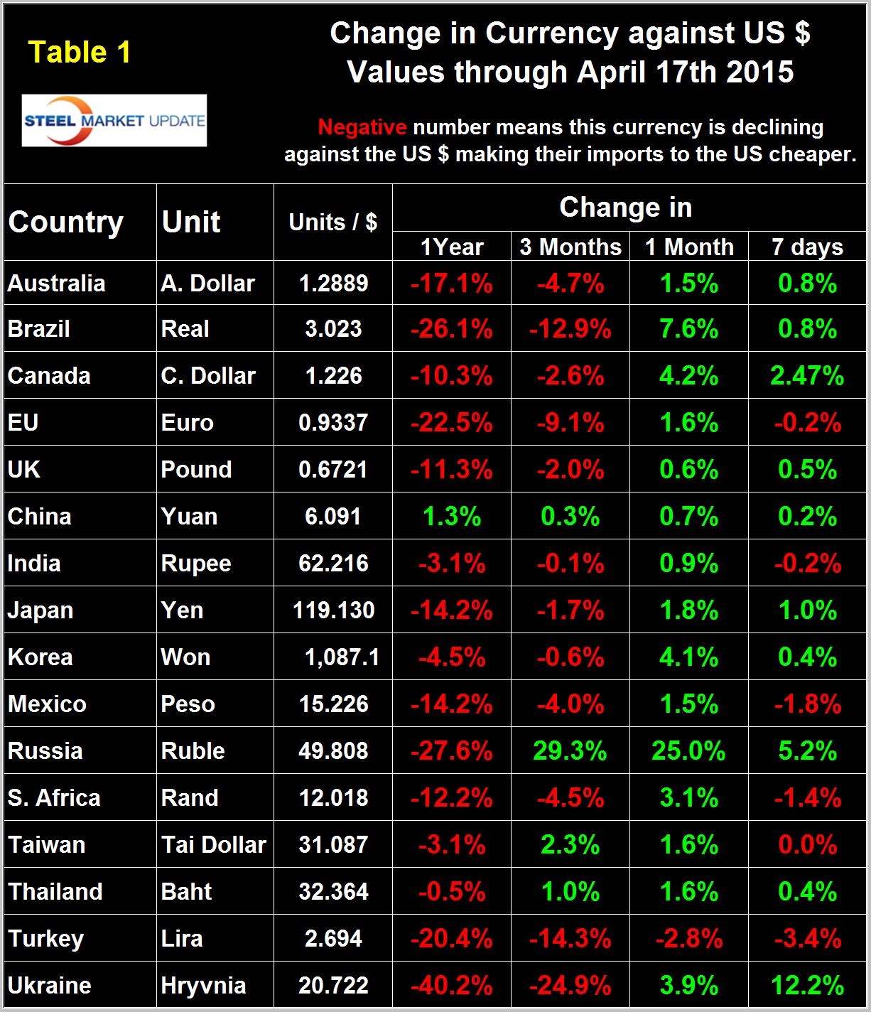 Our last publication of currency data was March 23rd and since then the wave of green in Table 1 has continued to move to the left. On February 14th, 13 of the 16 currencies listed were red in both the seven day and one month columns. On March 23rd 15 were green in the seven day column and 4 in the one month column. In this latest update 15 are green in the one month column and 10 in the seven day column. Therefore we can see that the currencies of the steel trading nations have been strengthening against the dollar for over a month. The only currency to decline against the dollar in the last month was the Turkish Lira and that decline accelerated in the last seven days. Table 1 is color coded to indicate strengthening of the dollar in red and weakening in green. We regard strengthening of the US Dollar as negative and weakening as positive because the effect on net imports. In 2014, the total U.S. trade volume was 25 percent of GDP therefore currency swings can have a huge effects on the rest of the economy.