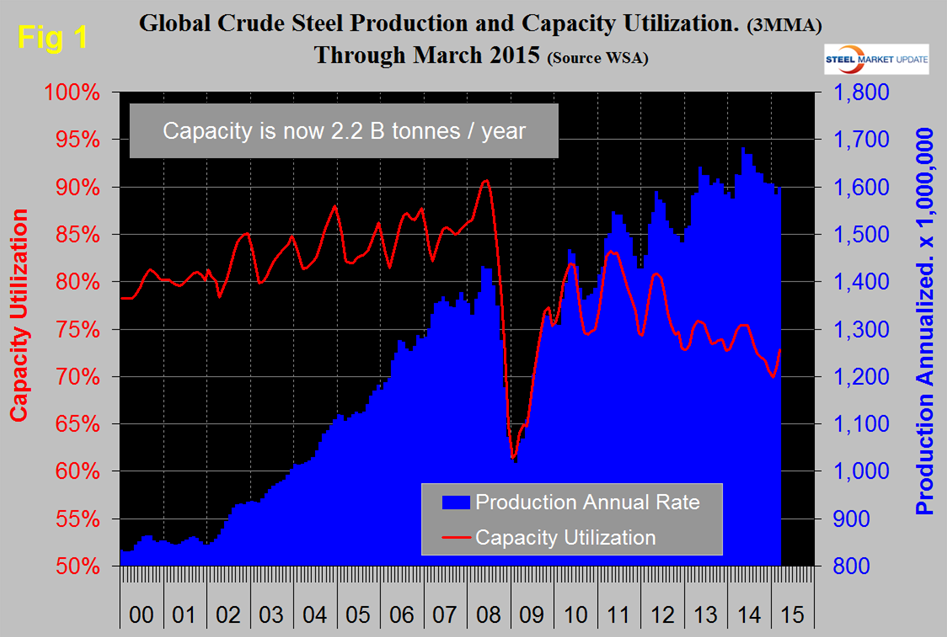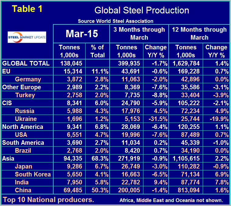 Global steel production in 12 months through March totaled 1.626 billion tonnes with a capacity of 2.2 billion tonnes which yields a utilization for the 12 month period of 73.9 percent. China accounted for 50.3 percent of global production in March. Asia as a whole, including India, accounted for 68.3 percent of global production. Production in March on a tons/day basis was 4.45 million tonnes down from 4.56 in February. Total March production was 138,045 million tonnes.