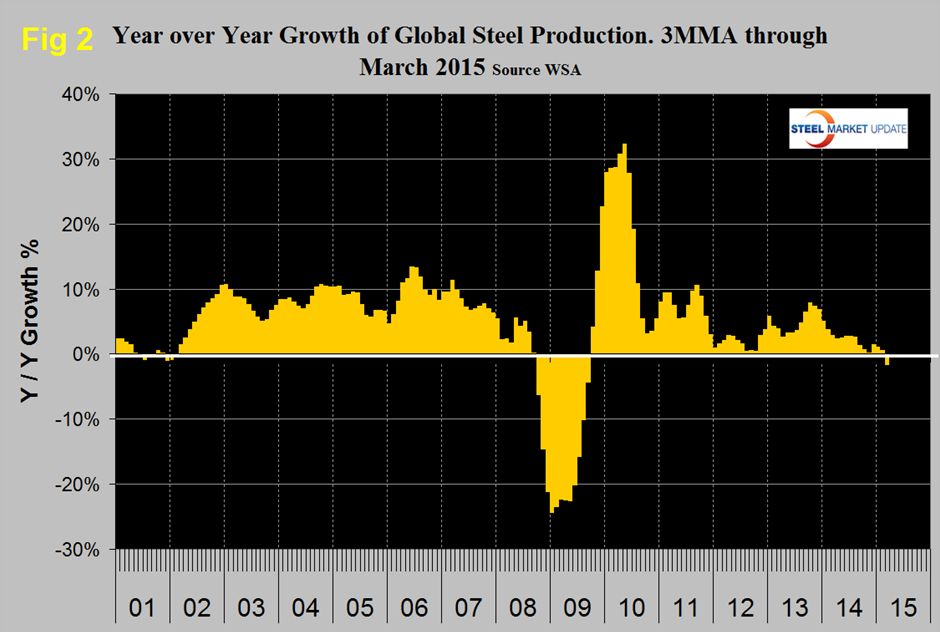 India is counted as part of Asia which overall is down but India on its own has strong growth with positive momentum. On a three month moving average basis, global growth has contracted for four straight months from positive 1.4 percent in December to negative 1.7 percent in March. The growth rate in twelve months through March 2015 was 1.4 percent compared to twelve months through March last year. In the three months through March only India had a decent performance with a 9.4 percent year over year growth rate, China was down by 1.4 percent. North America was down by 6.4 percent in total with the US down by 7.6 percent, Canada up 0.4 percent and Mexico down 5.0 percent. The European Union was down by 0.6 percent and other Europe led by Turkey was down by 7.6 percent. The effect of the war in Ukraine is clear in the contraction of that country’s steel production. Figure 2 shows the 3MMA of the monthly year over year growth of global steel production which was negative in March for the first time since September 2009. It is evident that the crash of 2009 and the recovery of 2010 were more or less a wash at the global level of steel production followed by a significant slowdown since 2011.