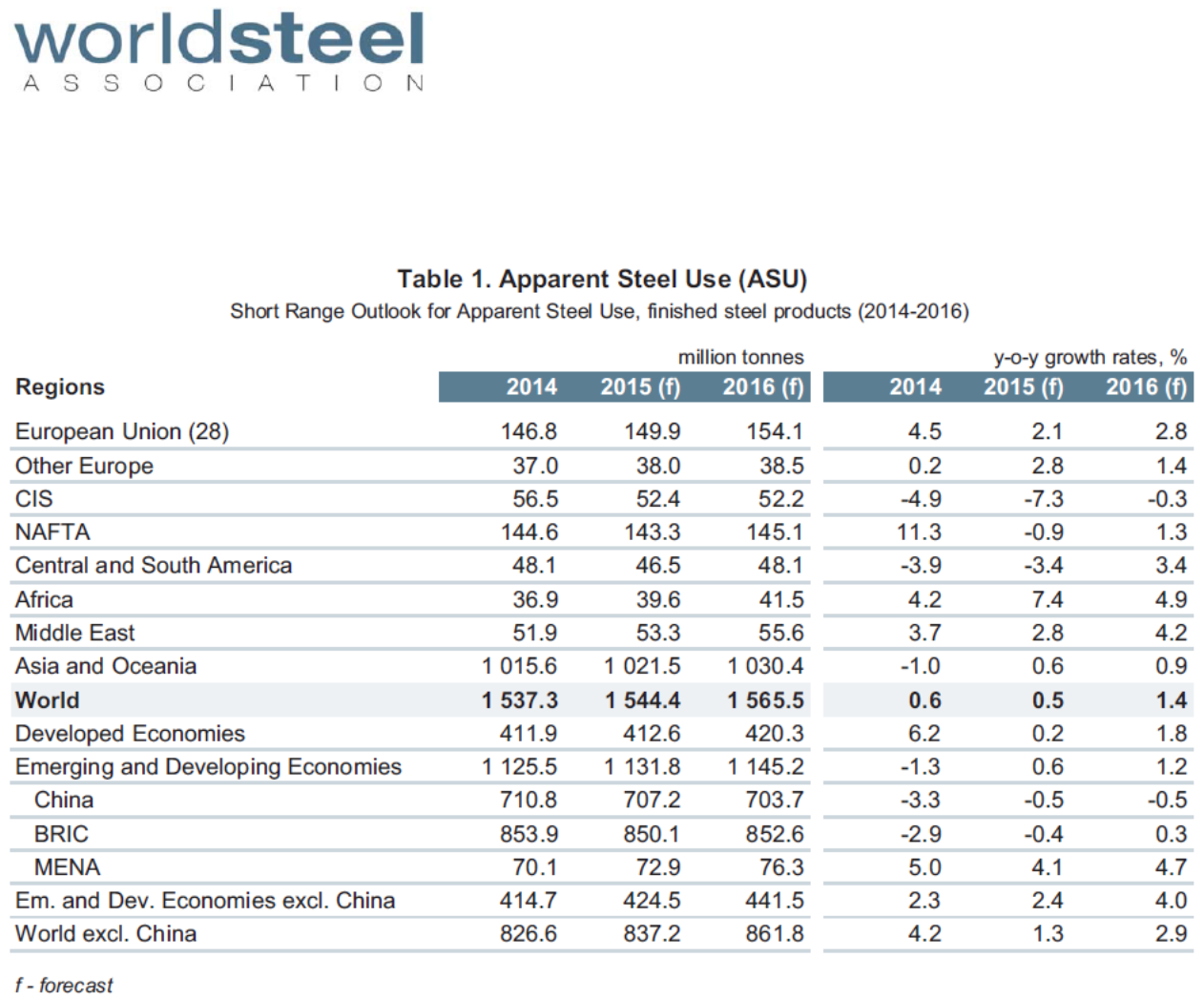 On Monday this week the World Steel Association issued their Short Range Outlook forecast for apparent steel consumption in 2015 and 2016. Table 2. Note this is steel consumption, not crude steel production which is the main thrust of this piece.