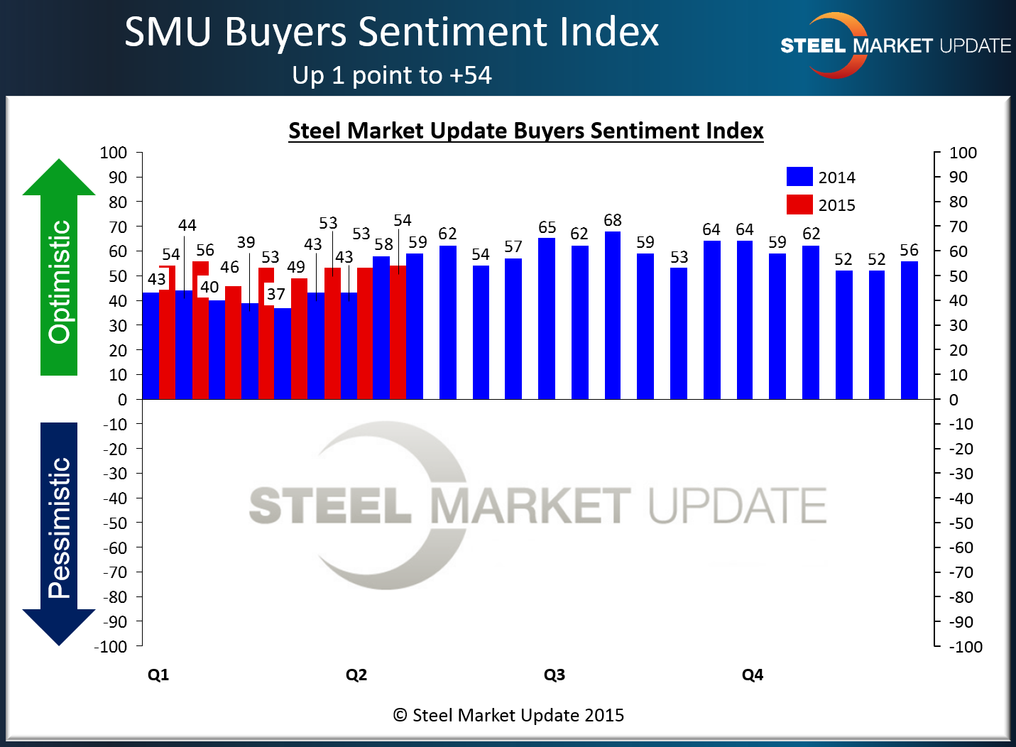 SMU Steel Buyers Sentiment Index is a measurement of the current attitude of buyers and sellers of flat rolled steel products in North America regarding how they feel about their company’s opportunity for success in today’s market. It is a proprietary product developed by Steel Market Update for the North American steel industry.