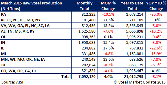 The American Iron & Steel Institute (AISI) recently reported final raw steel production estimates for the month of March 2015. The monthly estimates are different than the weekly estimates we report in our Tuesday issues; the AISI bases the monthly estimates on 75 percent of the domestic mills reporting vs. only 50 percent for the weekly estimates.