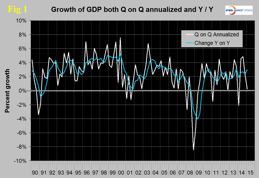 On a year over year basis GDP was 2.99 percent higher in the first quarter than it was in Q1 2014 and that result is in line with performance since Mid-2010. Q1 of 2104 had negative 2.21 percent growth due to the appalling winter in the North East US and the second and third quarter results which were very strong were likely playing catch-up. The fact that Q4 2014 and Q1 2015 were close to the year as a whole tends to support that view.