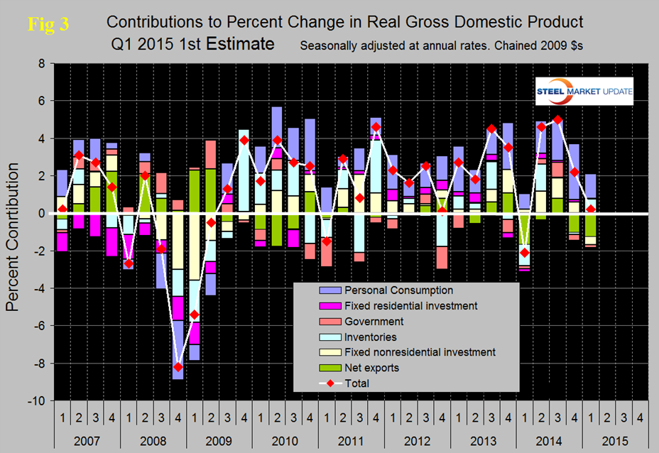 SMU Comment: We have reported frequently in the past on the relationship between GDP and steel consumption. Steel growth follows economic growth but is very much more volatile. In addition over the long run about a 2.5 percent growth of GDP is necessary to get any growth in steel consumption. Based on the trailing 12 month growth of GDP which in Q1 was 2.99 percent we can expect steel consumption to be fairly stable in H1 2015. The IMF forecast for 2015 at 3.09 percent growth if accurate suggests a moderate increase in steel demand.